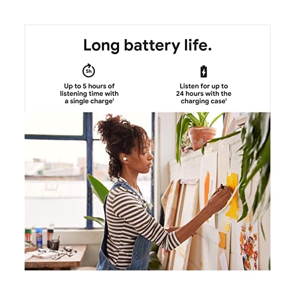 Pixel Buds A-Series bring you rich, high-quality sound for a lot less than you’d expect. Their beamforming mics help make calls crystal clear.[6] The flush-to-ear design and the stabilizer arc keep the earbuds comfortably in place. To play music, check the weather, or have notifications read to you, just say “Hey Google,” or press and hold the earbud for help.[2] And with up to 5 hours of listening time on one charge or up to 24 hours using the charging case, you can keep listening anywhere.[1] [1]All listening times are approximate and were measured using music playback and talk with pre-production hardware and software, with fully charged Pixel Buds A-Series and case, and other features disabled. Case is used to recharge Pixel Buds A-Series when their batteries are depleted. Charging times are approximate. Use of other features will decrease battery life. Battery life depends on device, features enabled, usage, environment and many other factors. Actual battery life may be lower. [2]Google Assistant requires a Google Assistant-enabled Android 6.0 or newer device, Google Account, and an internet connection. Data rates may apply. For available languages and minimum requirements go to g.co/pixelbuds/help.